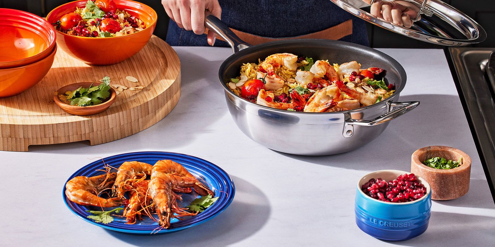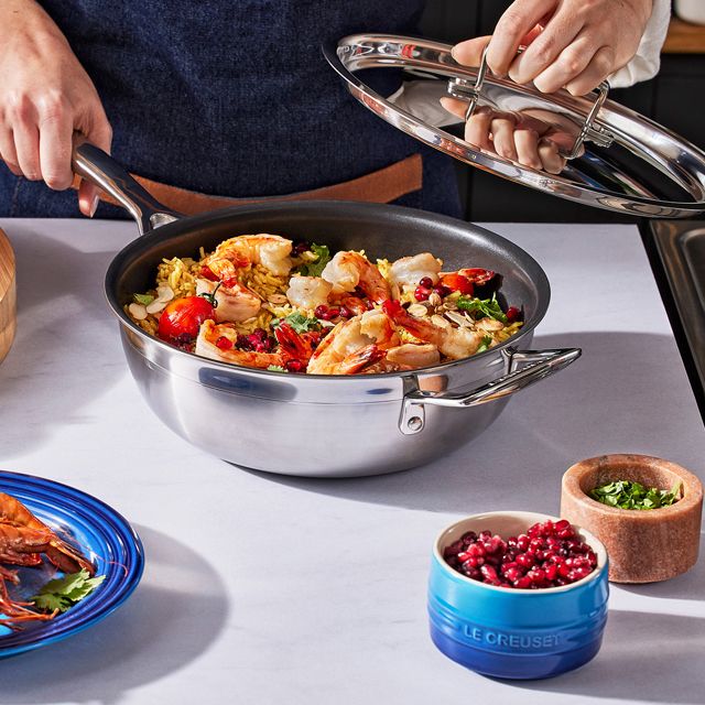 Zum Braten der Garnelen etwas Olivenöl in einer großer antihaftbeschichteten Aluminiumpfanne (28 cm) von Le Creuset auf mittlerer Stufe erhitzen. Sobald das Öl heiß ist, die Garnelen hineingeben und mit Salz und einem Spritzer Zitronensaft würzen. Sobald die Garnelen rosa sind, sind sie gar. In der gleichen Pfanne mit etwas mehr Olivenöl die Tomaten anbraten, bis die Haut aufplatzt und leicht gebräunt ist.